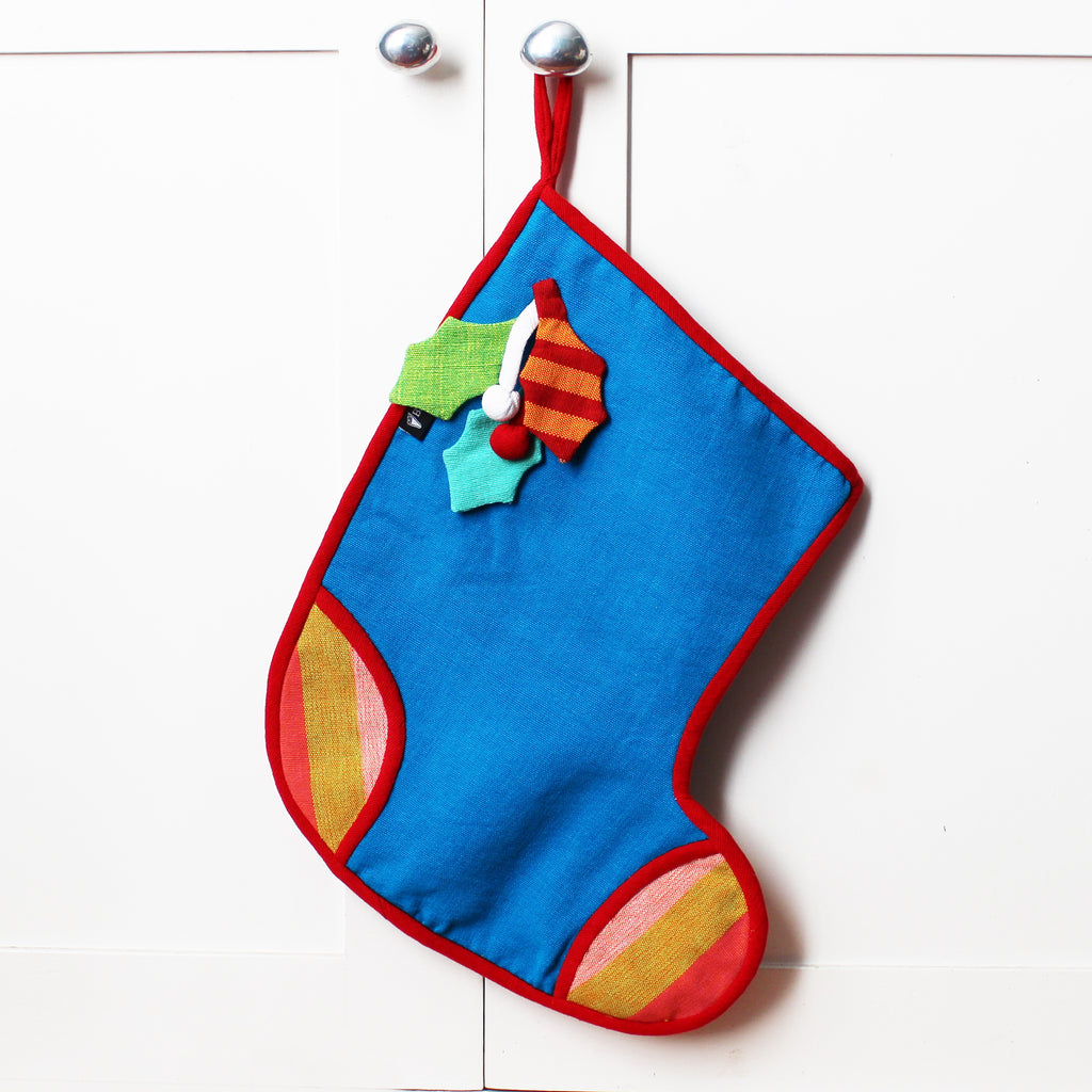 Barefoot handloom Christmas stocking, large size; holly decor - 5 designs