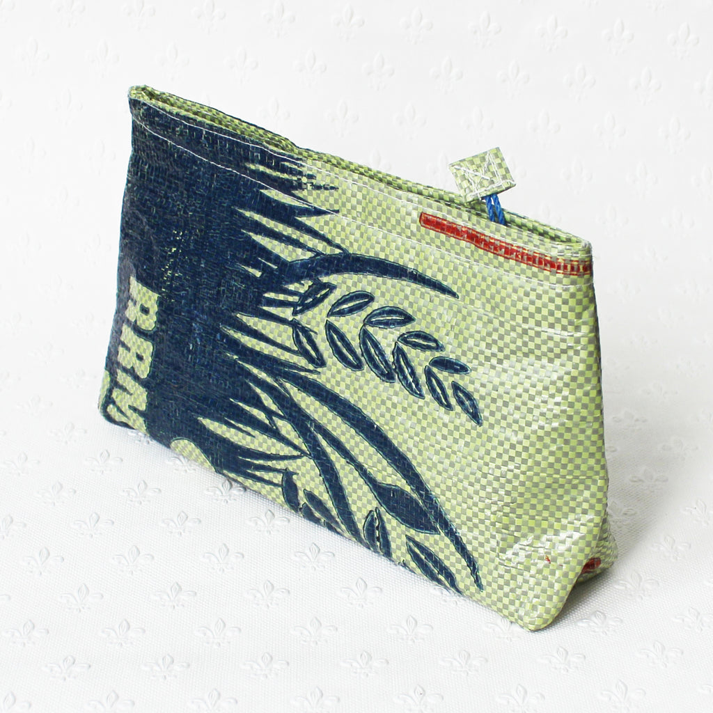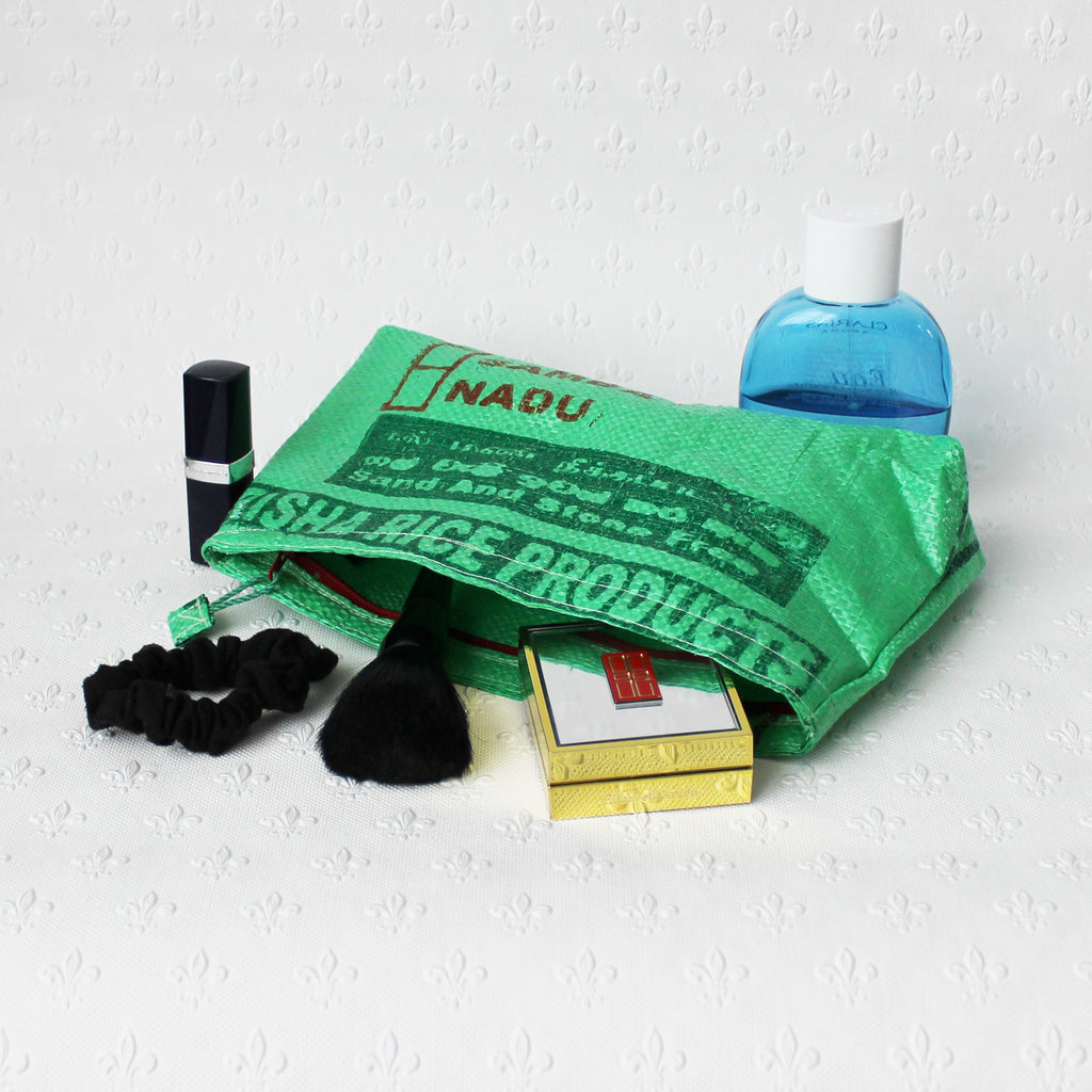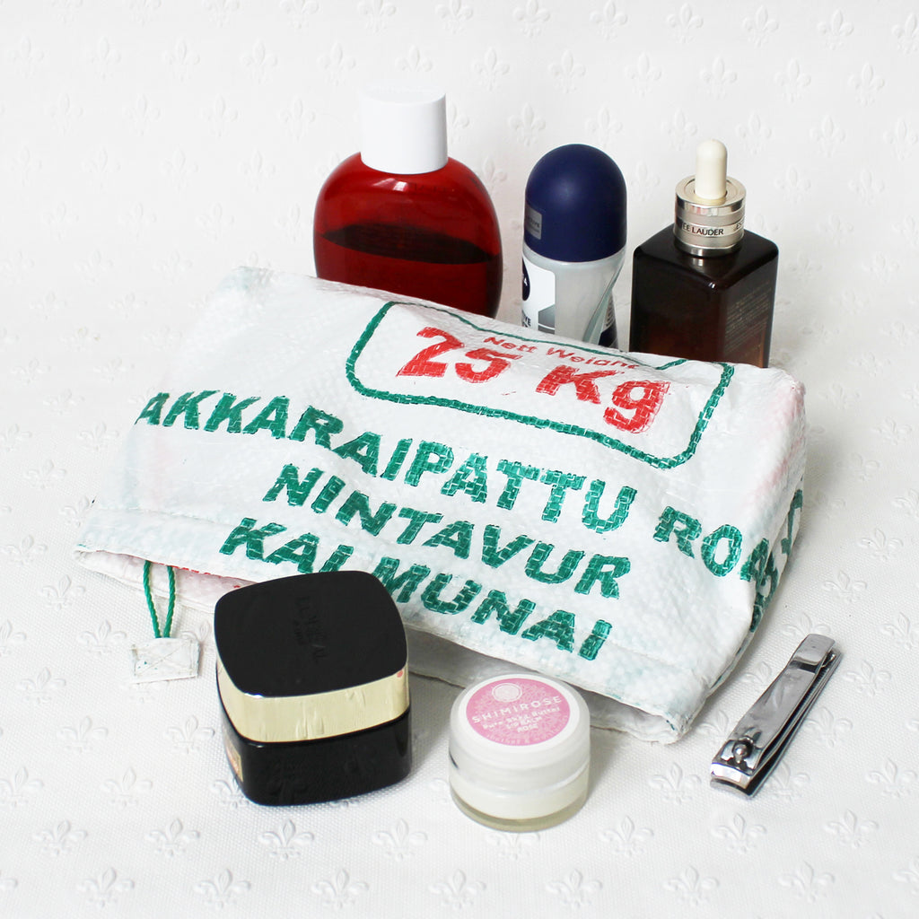 These cosmetic bags are handmade from upcycled plastic rice sacks at a Fair Trade-certified company in Sri Lanka. They are a simple yet effective way of re-using wholesale rice sacks which would otherwise have gone to landfill. Being waterproof, they are perfect for carrying cosmetics and wash items, firmly closed with a zip. They also make great pencil cases. There may be slight variations in design from the photo, but the main colours will be the same.