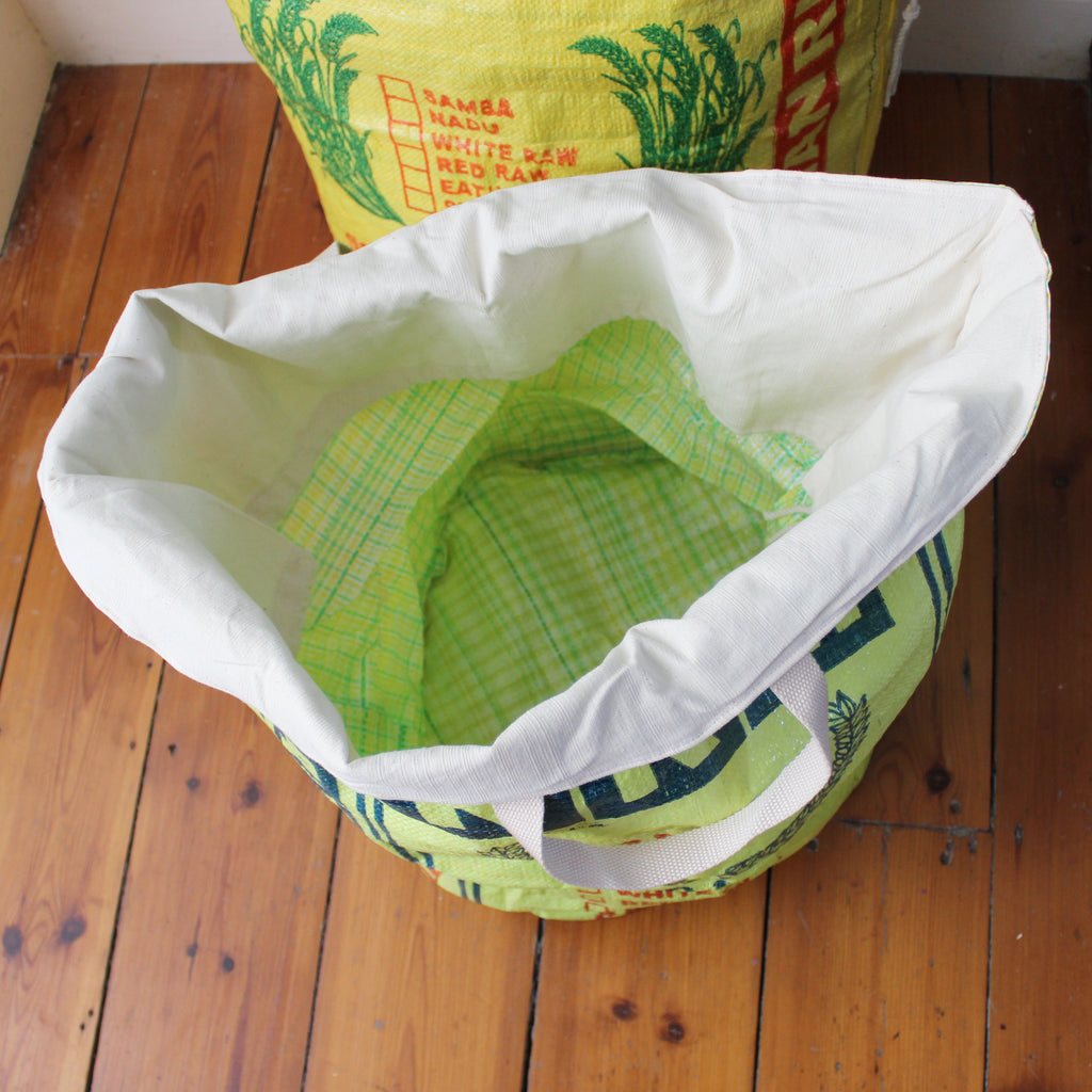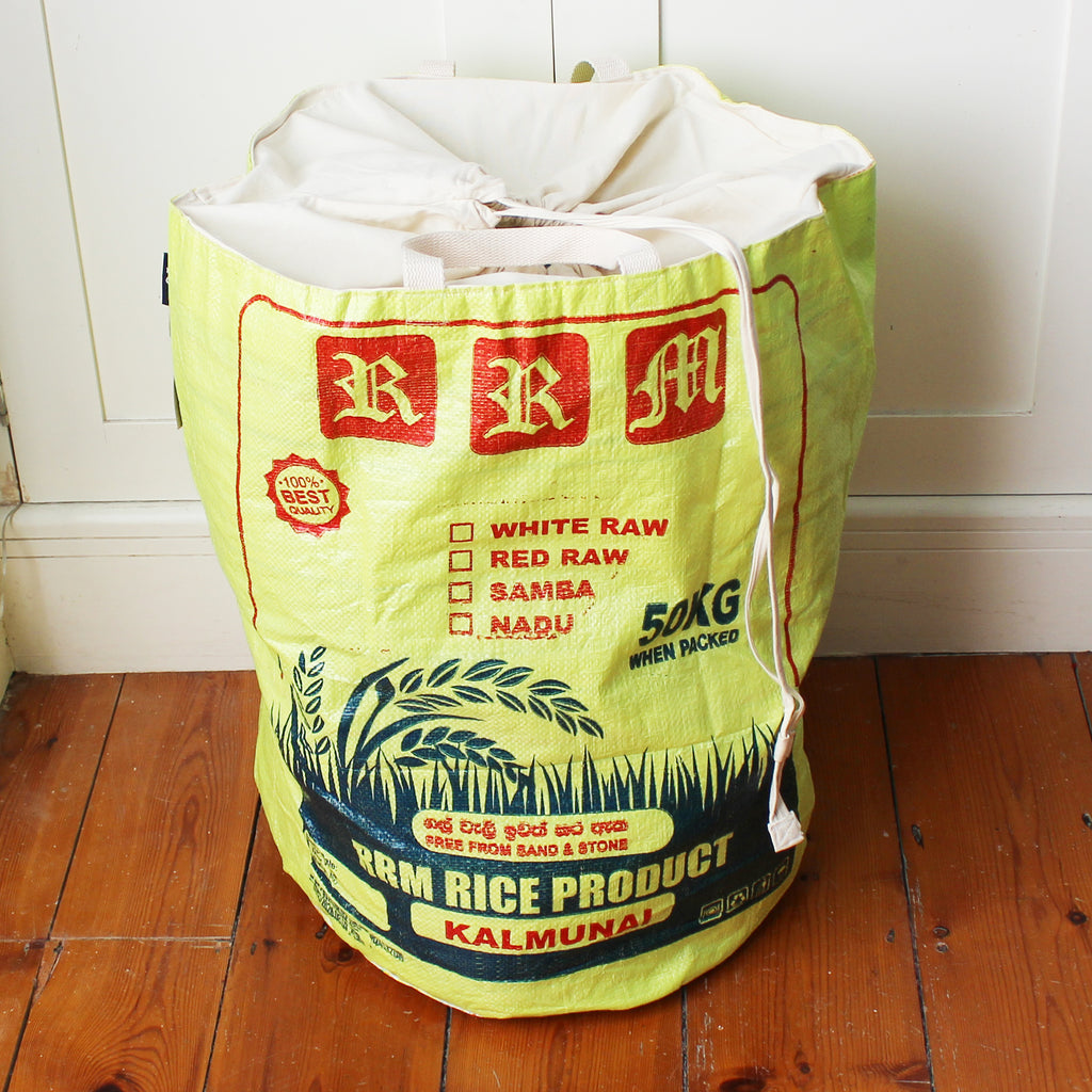 These extra large bags feature a cotton drawstring closure on the top and are roomy enough for the biggest laundry loads, or as storage for linen, towels and so on. Handmade by a Fair Trade company in Sri Lanka, they are a wonderful adaptation of the large sacks that are used across Asia to transport rice, grain and other commodities, which would otherwise get burnt or go to landfill waste dumps. Now they make excellent storage bags and provide employment at a fair wage for the women who make them.